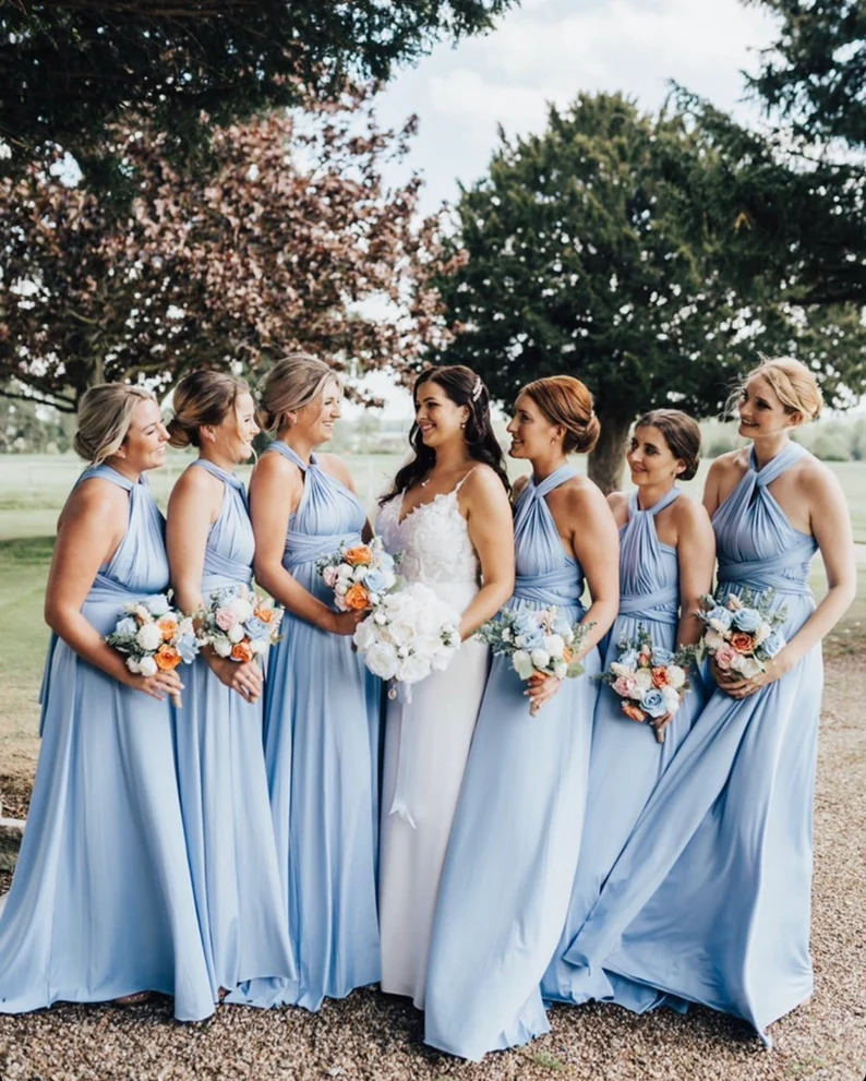 Infinity Dress in dusty blue creates a romantic, ethereal look. Add teal jewelry for a pop of color, or keep it classic with pale pink flowers.